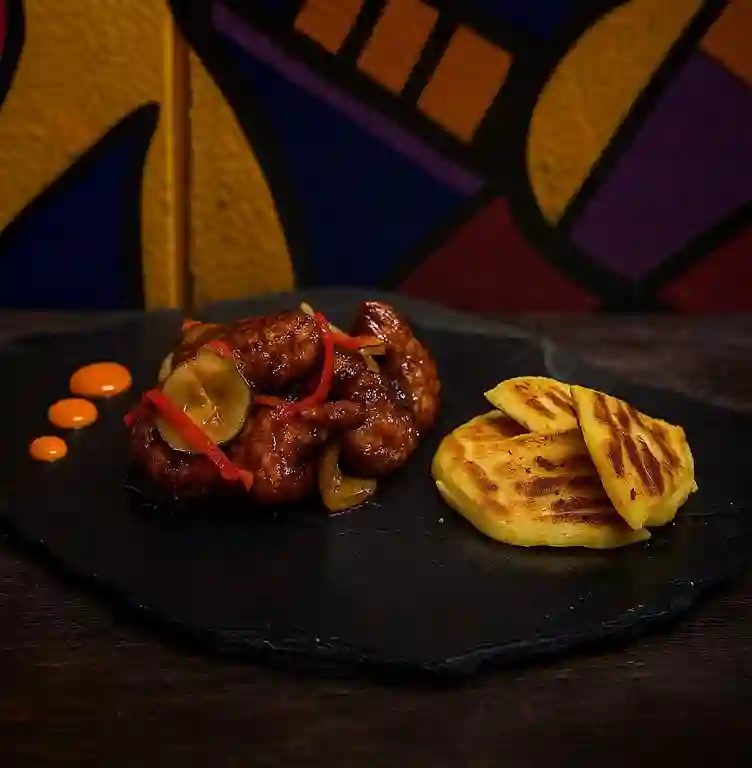 Alitas crocantes y extra jugosas sin hueso, caramelizadas en melao de limón mandarino, pepino y ají dulce encurtido (no pica), acompañadas de arepa de yuca con queso 7 cueros, y finalizadas con alioli achiotado.