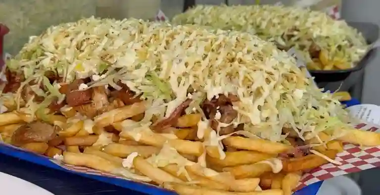 Papas, salchicha super ranchera, chorizo, salchichon cervecero, carne desmechada, queso costeno rallado, lechuga y pico e gallo, salsa rosada de la casa salsa tartara de la casa.
