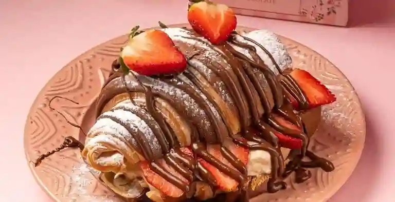 Croissant con crema de la casa, chocolate, fresa, helado, kinder y chocolate.