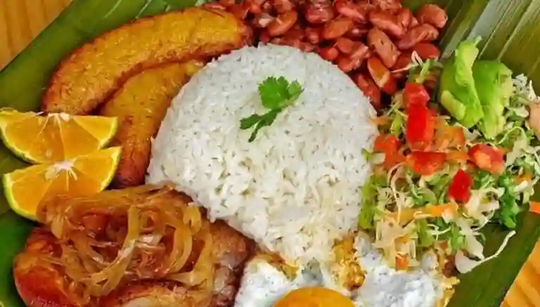 Carne en bistec con caldo, arroz, patacones, bebida elección