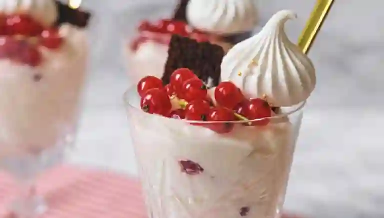 Merengon con helado de vainilla francesa, 2 frutas, 1 toppings y salsa a elegir