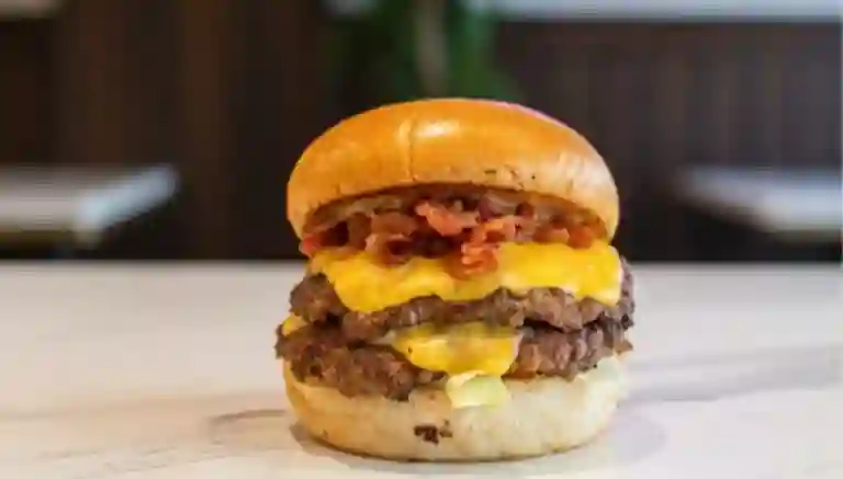 Suave pan de papa, carne de res en smash, finos corte de cebolla cocinadose con la carne, queso cheddar americano, tocineta crocante, lechuga, tomate, salsa romans y porción de papas fritas.