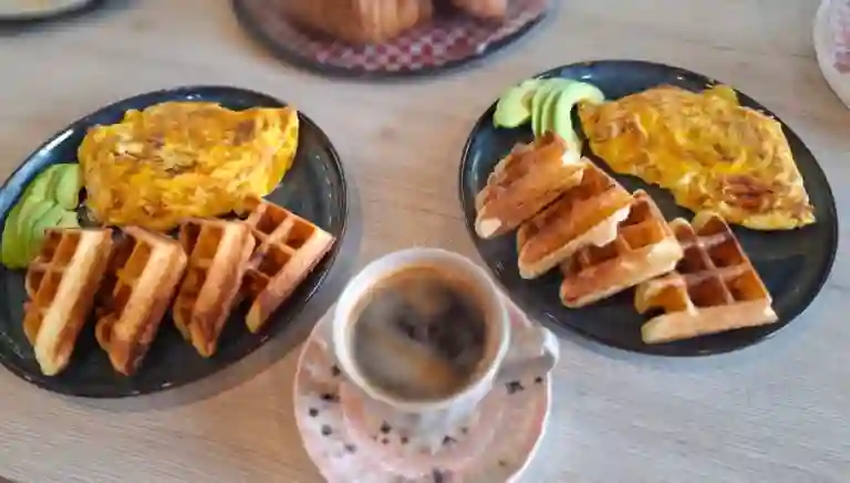 Omelette De Huevos Frescos Relleno De Pernil De Cerdo Y Queso Mozzarella, Acompanado De Wafflebono, Aguacate Y Tomates Cherry Del Huertoservido Con Cafe Americano.