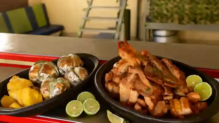 Picada de carnes al barril ( chata churrasco , bondiola de cerdo, chicharron al barril, chorizo santarrosano )1200gr acompañado con papa al vapor platano al barril salsa de la casa y pico de gallo