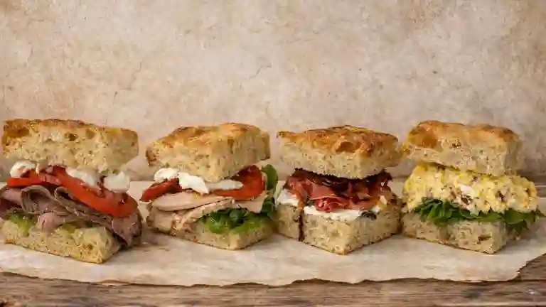 Sándwich con pan focaccia 100 masa madre con roast beef, tomate crudo, pepinillos triturados, queso de búfala. (ingredientes frescos y reales).