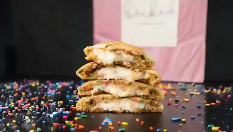 Galleta de masa de vainilla con chips de chocolate blanco, pecanas en trozos, rellena de caramelo salado y terminada con crumb de mantequilla tostada.