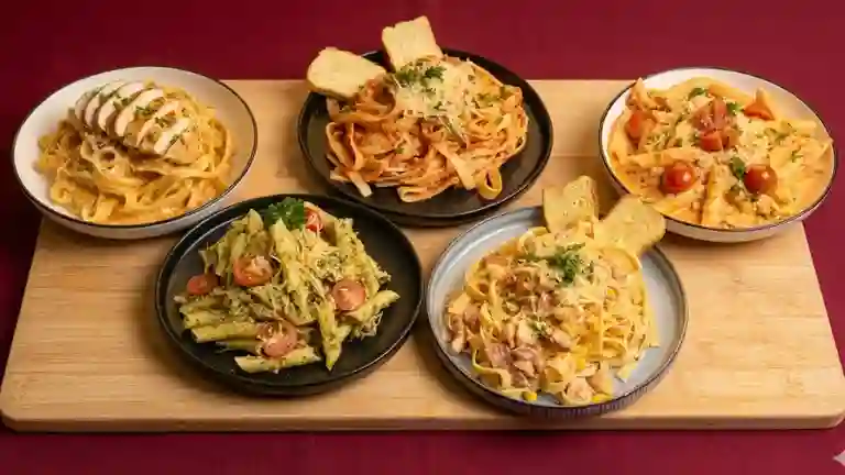 Pasta larga en salsa carbonara-alfredo, preparada con pollo, jamón, tocineta, maicitos y queso mozzarella. lleva crema de leche, queso parmesano y un toque suave de especias que equilibra el sabor. incluye tostadas.