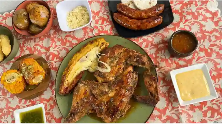1 Pollo artesanal jugosito y asado al carbón acompañado de 4 papas, 4 arepitas de maíz, salsa marco pollo, pesto, ají y gaseosa 1.0