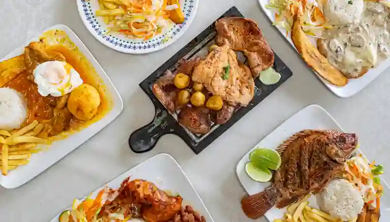 Sobrebarriga criolla jugosa, servida con arroz blanco, papas francesas, plátano maduro y ensalada fresca de la casa