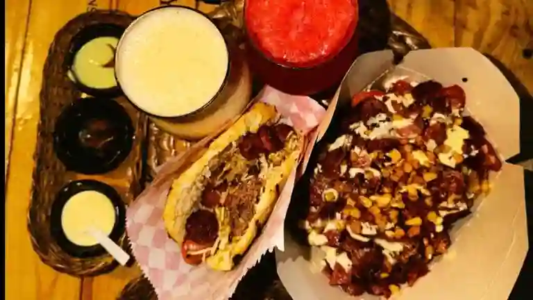 Arepa de maíz, chorizo parrilla, queso, ripio de papa, salsas beraka ajo y verde