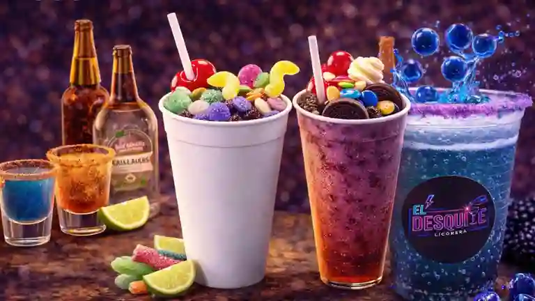 Granizado con licor, decorado con gomitas, rodajas de naranja y cerezas. Elige entre varios sabores.