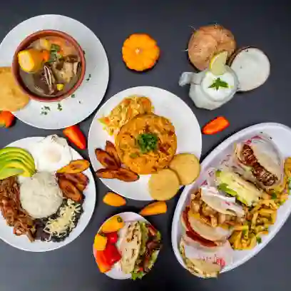 Mondongo con carne de cerdo, chorizo español, garbanzos y verduras mixtas. Acompañado de arroz, patacones, arepa y aguacate.