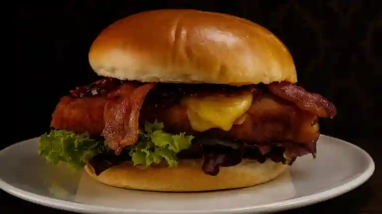 Pechuga de Pollo crispy , queso Cheddar , tocineta ahumada ,mermelada de frutos rojos , mix lechuga , cebolla caramelizada