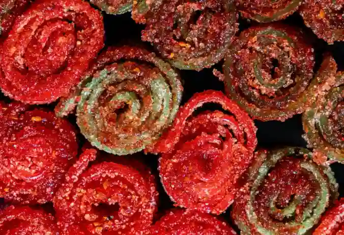 Mix de tiras de sandía, manzana verde y fresa, enrolladas y cubiertas de azúcar.