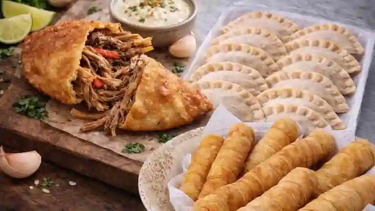 5 empanaditas artesanales de masa crujiente, rellenas con jugosa carne desmechada sazonada con especias tradicionales. Recién fritas, doraditas por fuera y suaves por dentro. Incluyen salsa de ajo cremosa de la casa.