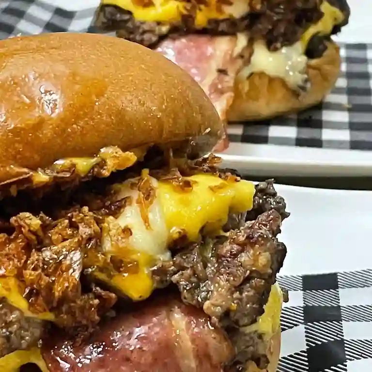 Pan doble carne artesanal 120gr c/u , tocineta, doble queso cheddar, queso mozarella, cebolla crispy y aro de cebolla