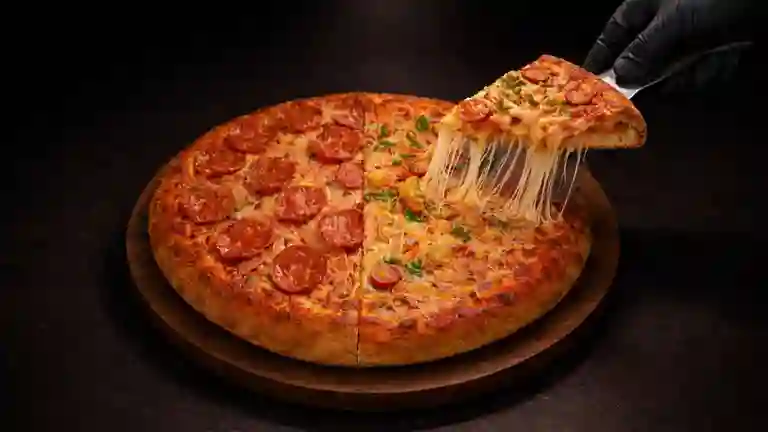 Pizza grande de 8 porciones con 2 sabores a elegir. Incluye ingredientes como pepperoni y vegetales. Ideal para compartir.