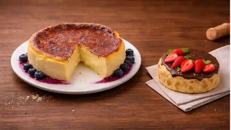 Tarta vasca grande y cremosa acompañada de una porción generosa de arequipe. Ideal para compartir (6-7 personas).