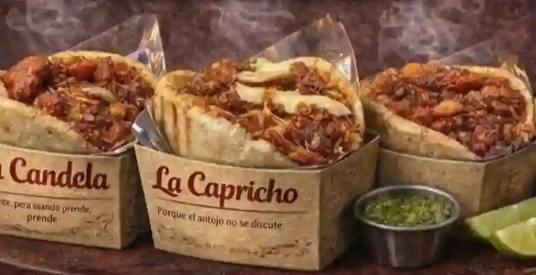 Carne y pollo desmechado, chicharrón, tocineta, costilla y trozos de maduro, con nuestras salsas más hogao de la casa.