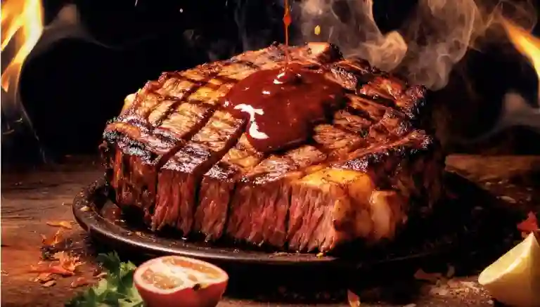 costilla asada a la parrilla con salsa BBQ de 400 gr acompañada de papas a la francesa y ensalada de la casa