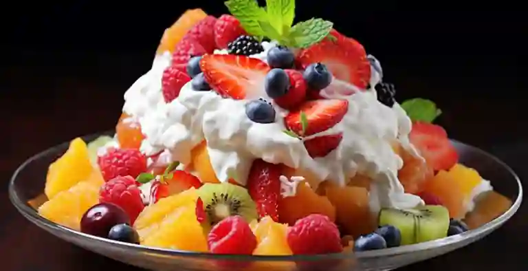 Base de frutas papaya, melón, mango, fresa, banano, manzana, fruta picada, crema de leche y queso