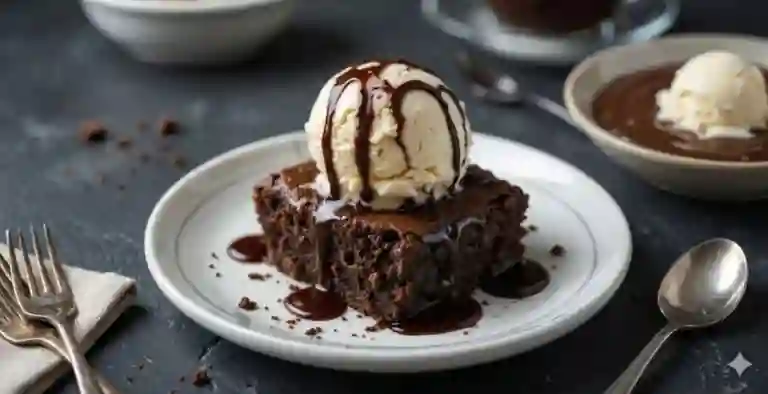 Brownie melcochudo servido con una generosa bola de helado de vainilla.
