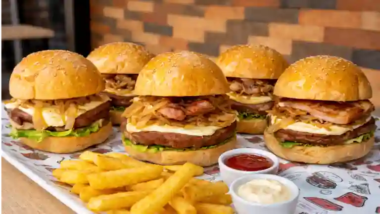 Pan ajonjolí, carne de hamburguesa, queso doble crema, cebolla caramelizada, lechuga, tomate, salsas de leña y salsa showy.