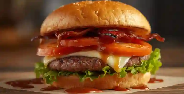 Hamburguesa con carne, lechuga, tomate, cebolla caramelizada, queso y salsa.