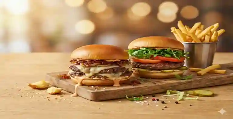 Hamburguesa de carne160 gr pechuga apanada 150gr con queso, cebolla crispy, dip de pimentón, tocineta y salsa dela casa. Incluye papas.