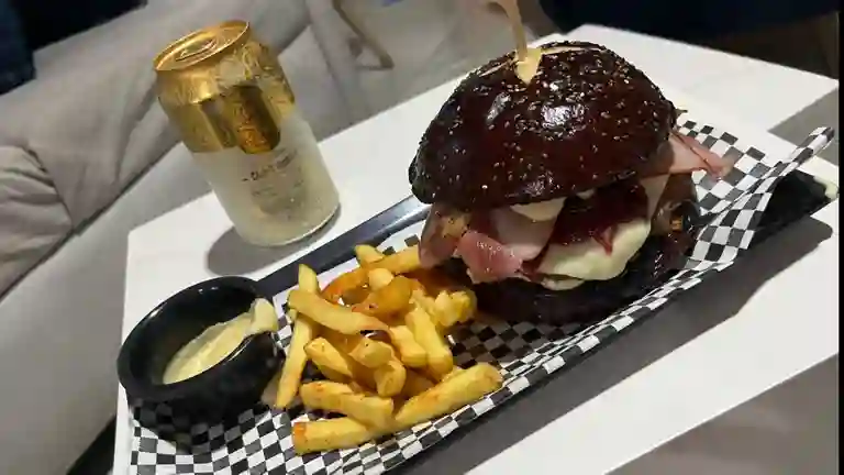 Pan artesanal, carne angus, queso costeño asado, chorizo, chimichurri de mango y papas a la francesa