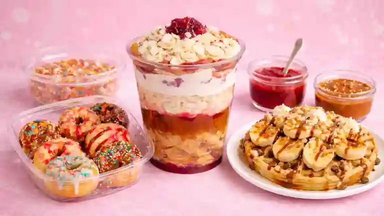 Escoge 4 salsas (mora, piña, leche condensada, chocolate o arequipe) y 4 toppings (barquillos, oreo triturada, pepitas de colores o chips de chocolate)