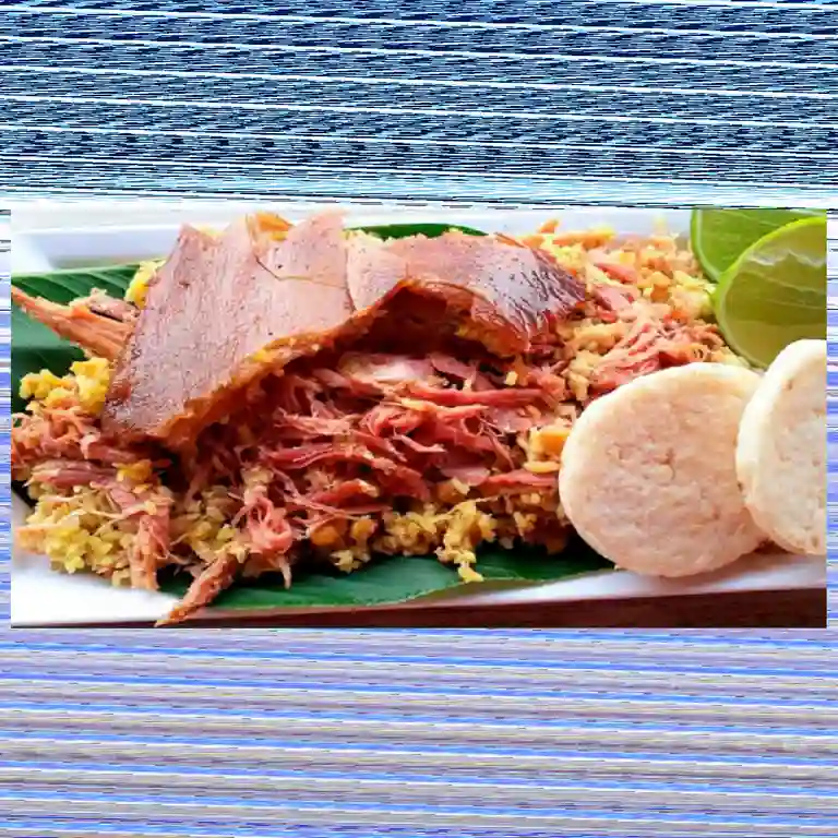 Porción individual de lechona, ( Lechona a base de carne de cerdo, arroz, alverja ) acompañada de una arepa.