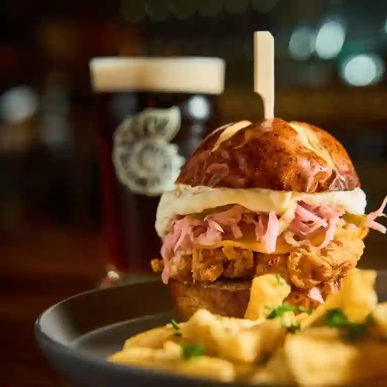 Pan pretzel, crocante y jugosa pechuga apanada, coleslaw, pepinillos y salsa ranch, acompañada de papas y salsa de la casa.