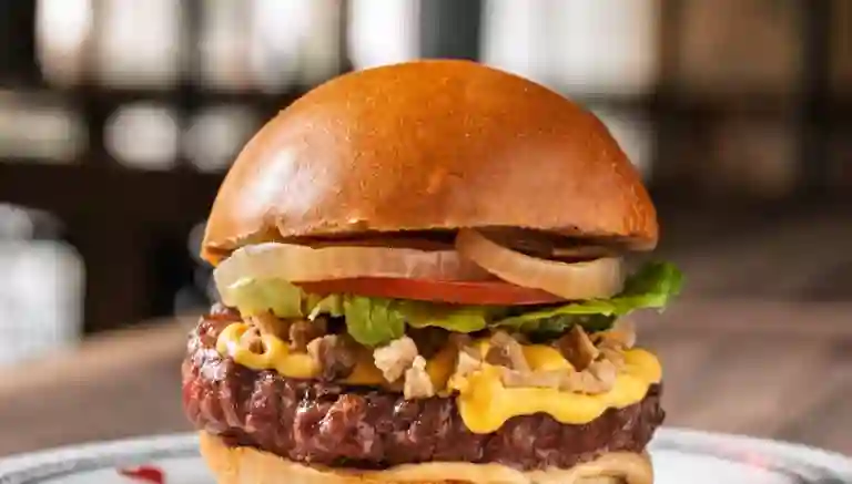 Carne de res de 180g, con salsa de queso cheddar, pan brioche con salsa de la casa, crispy de cerdo, cogollos, tomate y cebolla grille.