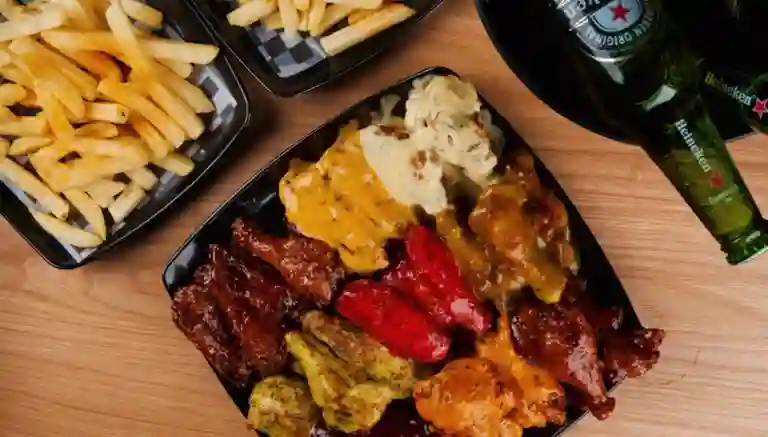 15 Alitas de pollo + 10 costillas + papas fritas y salsa a elegir.
